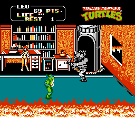 Gra firmy KONAMI. Głównymi bohaterami tej wideo gry były Wojownicze Żółwie Ninja, doskonale znane z filmu i bajek o tym samym tytule. Dysponowaliśmy czterema postaciami, z których każda po wciśnięciu klawiszy A+B na joypadzie używała innego zabójczego ciosu. Każdy z bohaterów posiadał również inną broń oraz charakterystyczną opaskę wokół oczu. Byli to Leonardo (nosił niebieską opaskę, używał dwóch katan), Raphael (kolor czerwony, dwa sztylety), Donatello (fioletowy, kij) oraz Michelangelo (pomarańczowy, dwa nunchaku).