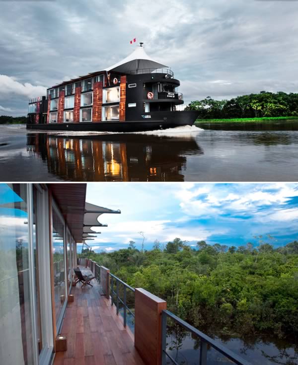 Rezerwując pokój w pływającym hotelu Aria Amazon – Aqua Expedition’s mamy szanse podróżować po największej rzece świata – Amazonce. Hotel zaprojektował Peruwiański architekt Jordi Puig, który umożliwił turystom pływanie po Amazonce oraz jednocześnie monitorowanie stanu i jakości środowiska rzeki. Hotel może pomieści 32 gości. Mają oni dostęp do wielkiego salonu, siłowni oraz jacuzzi na świeżym powietrzu.