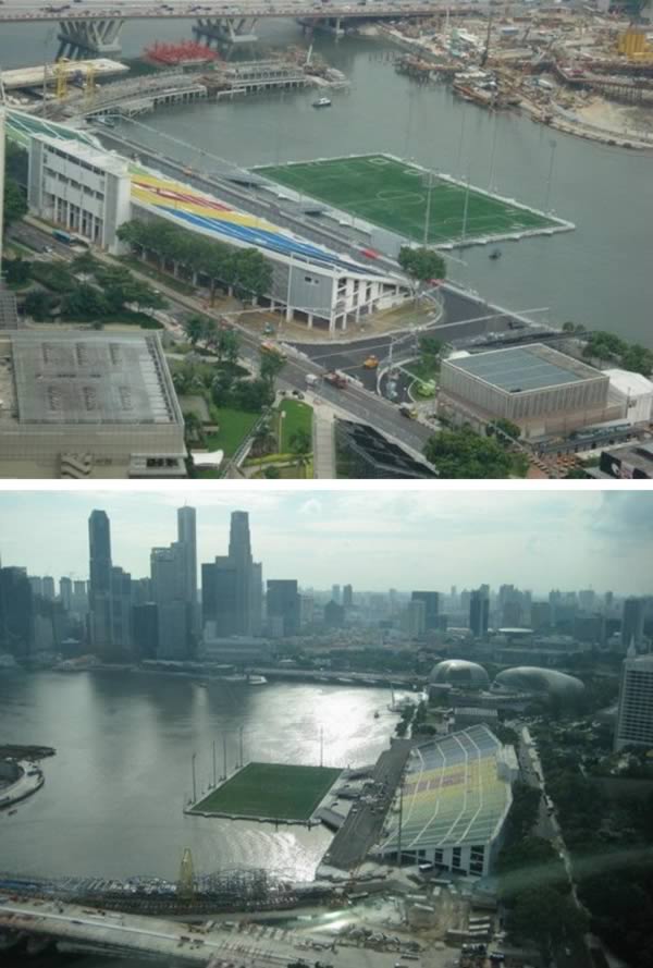 W związku z trwającymi Mistrzostwami Świata w Brazylii prezentujemy niecodzienny stadion. Pływająca platforma Marina Bay jest największym na świecie pływającym boiskiem. Znajduje się w Singapurze. W całości zbudowany ze stali, mierzy 120 metrów długości i 83 metry szerokości. Stadion może „unieść” 1070 ton, co równa się około 9000 ludzi.